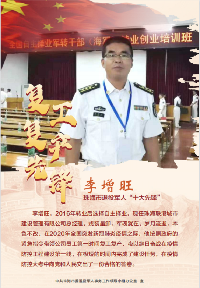 2022年4月26日,接珠海市委退役軍人事務工作領導小組辦公室通知,珠海聯(lián)港城市建設管理有限公司總經(jīng)理李增旺獲評“珠海市退役軍人十大先鋒—復工復產(chǎn)先鋒”。